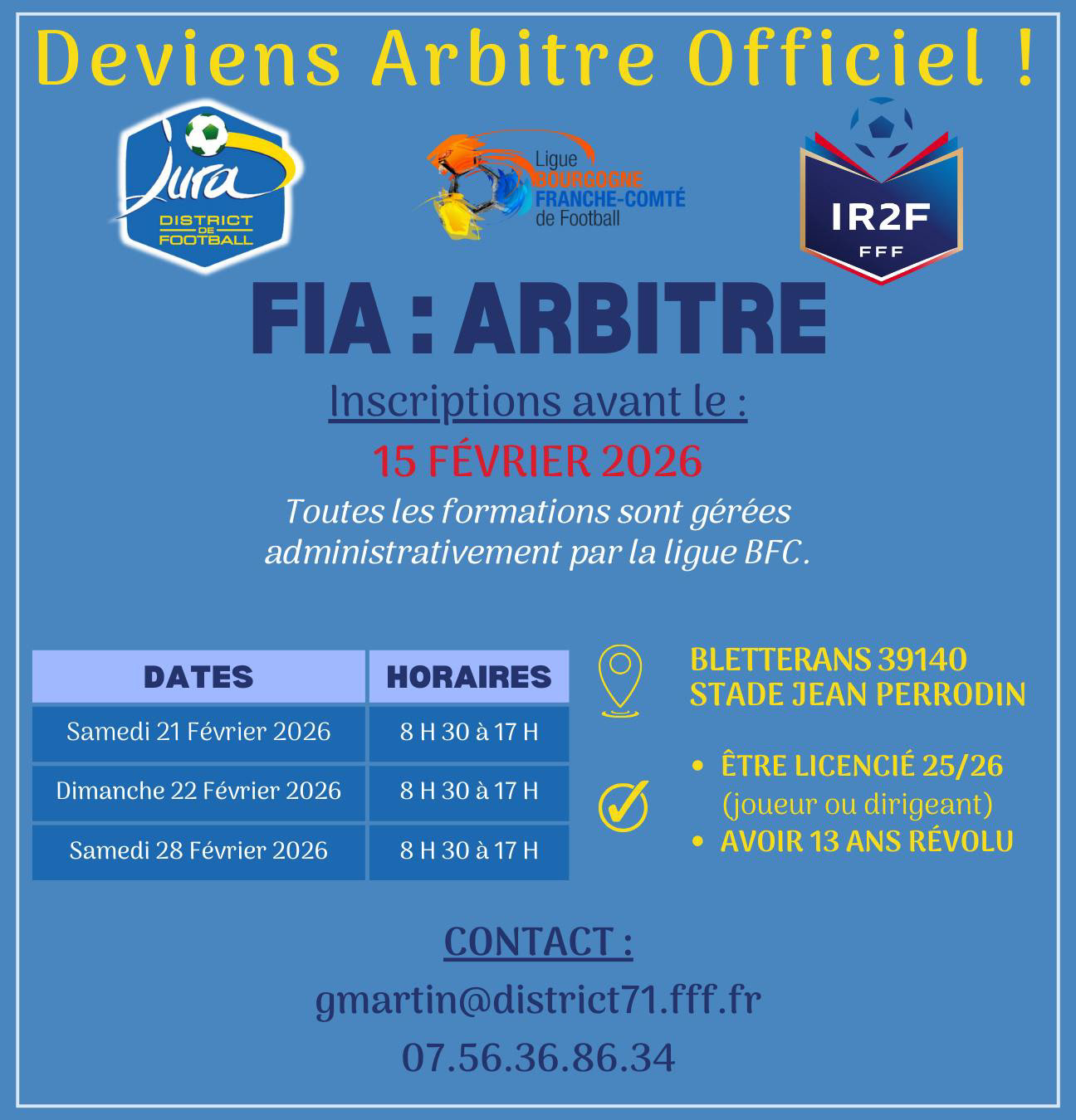 Vous souhaitez vous engager autrement dans le football et découvrir le rôle essentiel de l’arbitre ? Le District du Jura organise une formation initiale d’arbitre ouverte aux passionnés de football !
