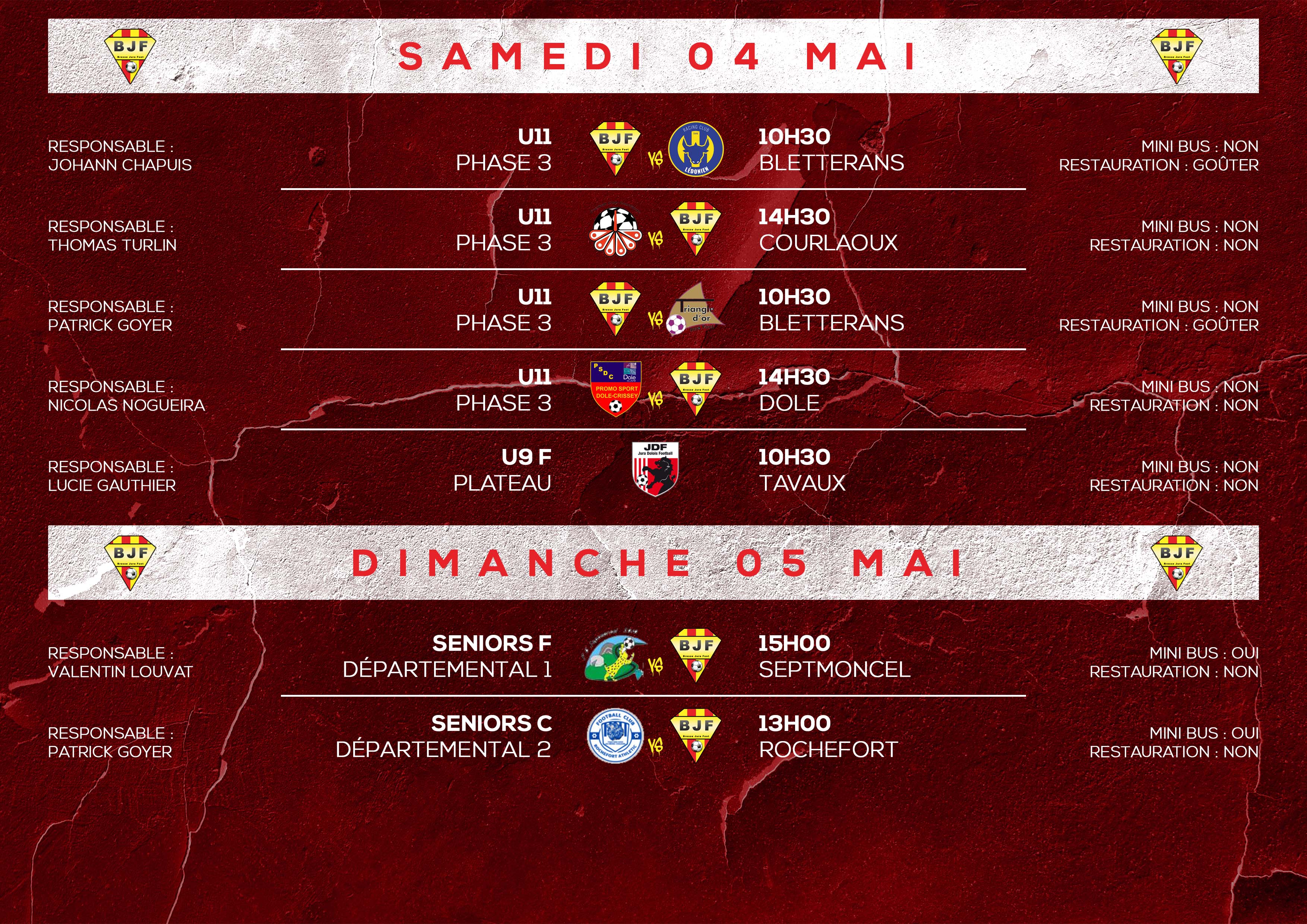 Le programme du week-end (04 et 05 mai) 03 Mai 2024Uncategorized Retrouvez le programme des matchs de vos équipes ce week-end.
