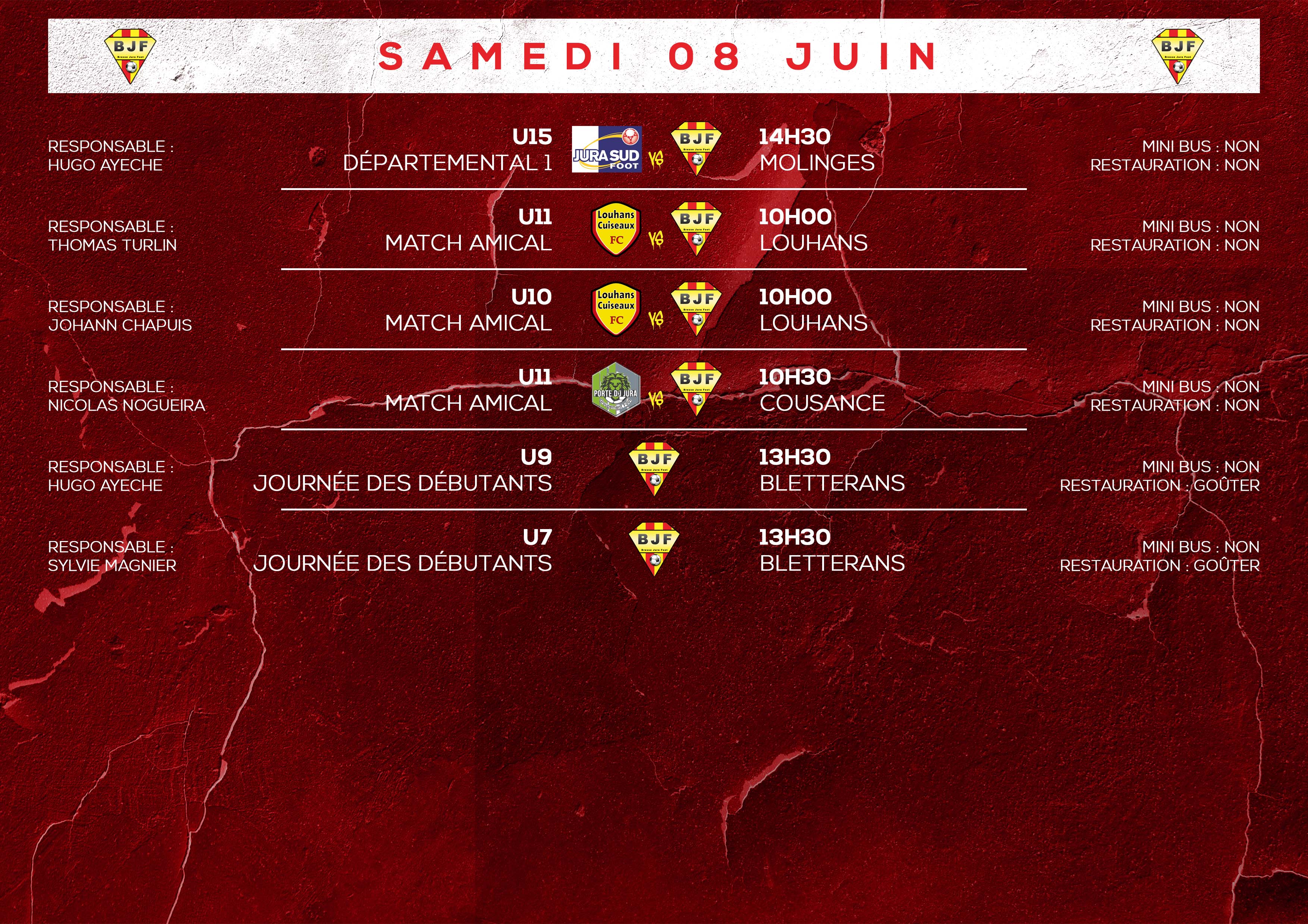 Le programme du week-end (08 juin) 07 Juin 2024Uncategorized Retrouvez le programme des matchs de vos équipes ce week-end.