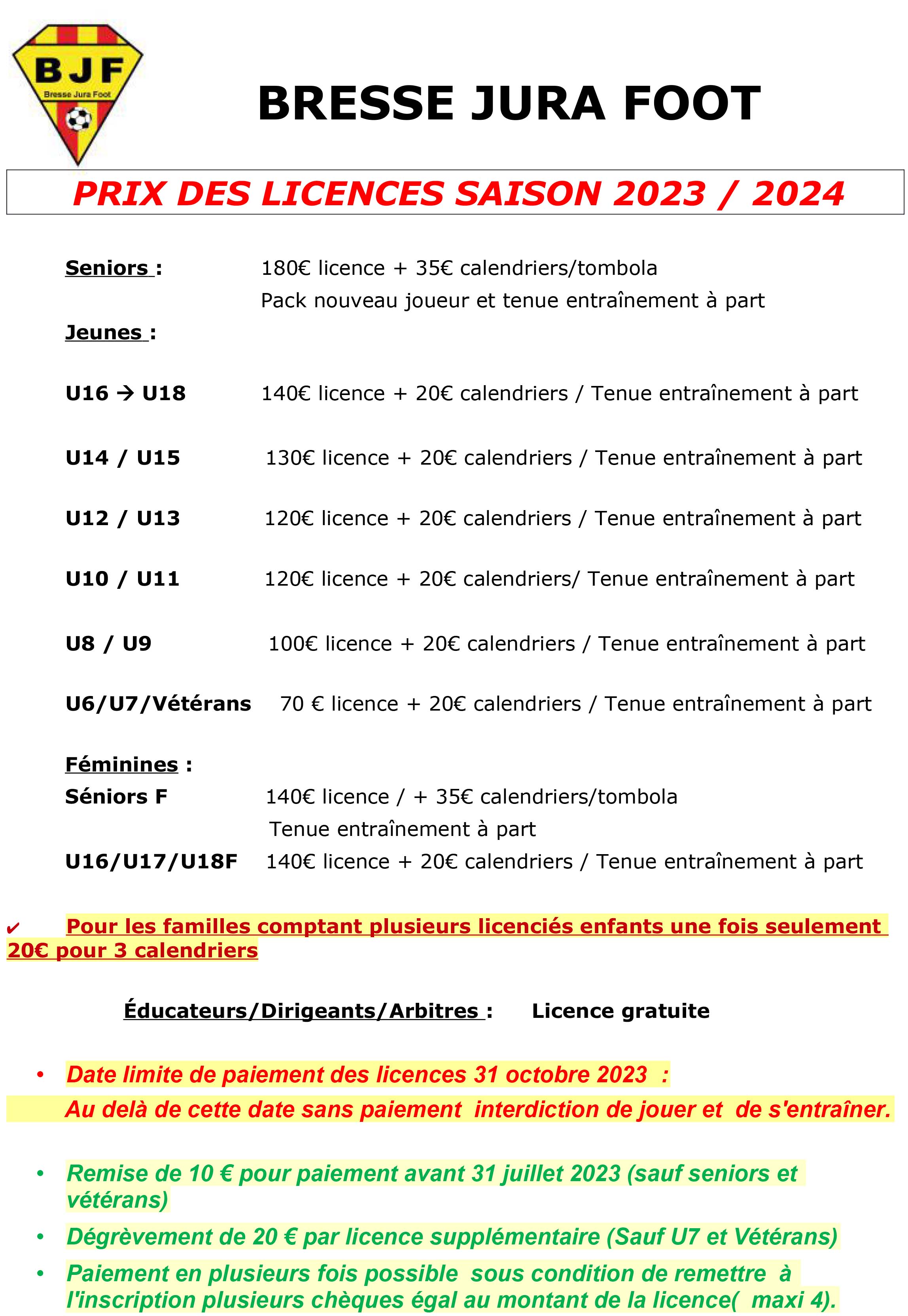- Le tarif des licences :