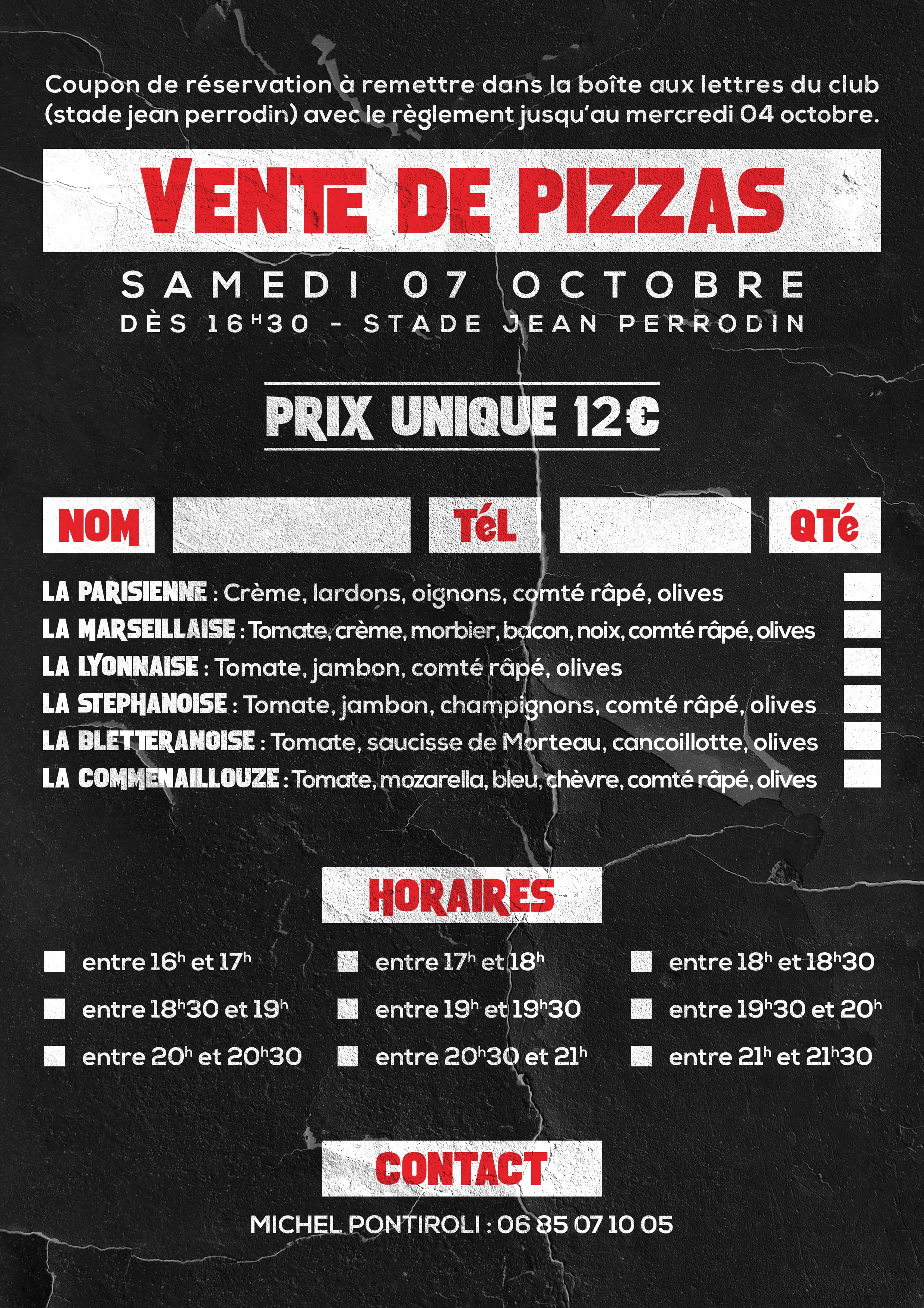 Afin de réserver vos pizzas, veuillez remplir le coupon ci-dessous et le déposer dans la boîte aux lettre du club avec le règlement avant le mercredi 04 octobre.